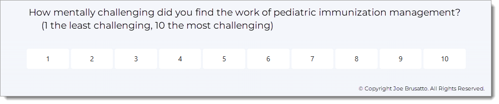 The project’s first measure is the difference in reported mental workload between the standard EHR workflow and the workflow using the vaccine forecast report, measured using a 10-point scale. For this measure, the participant will be asked two questions, one referencing the standard EHR workflow and one in the context of using the Smart Shots report.