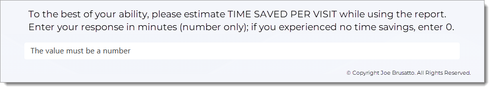 The second measure is the reported estimated time savings per visit, in minutes, between the standard EHR workflow and the workflow using the vaccine forecast report. For this measure, the participant will be asked to estimate the sime savings per visit, if any, while using the report.