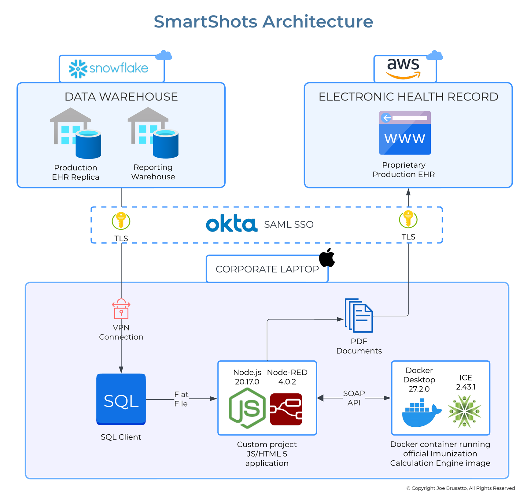 Each morning, immunization history for the participant’s pediatric patients with scheduled appointments for that day is exported to a flat file on a corporate laptop. This timing ensures that updates from immunization registries, which occur 24 hours before appointment time, are applied to patient charts and available in the data warehouse before the export. The Smart Shots application imports the flat file and generates an HL7 Virtual Medical Record (vMR) representation of the patient’s immunization history. The application then calls a SOAP API on an Immunization Calculation Engine (ICE) service running in a local Docker instance, which evaluates the data and returns a vMR response. The response data for each patient is processed and saved as a JSON file on the local machine, which is used to render and save the Smart Shots report as a PDF file. The file is manually uploaded to the patient’s chart using an EHR utility. After processing each day, all PHI, including the source data file, JSON file, and PDF, are deleted from the local machine.