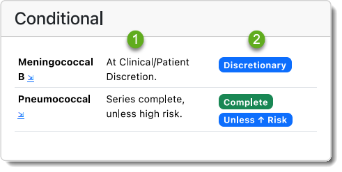 - Conditional group: Any vaccines which are conditionally recommended based on shared decision-making or high risk groups.