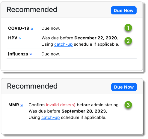 This group displays any vaccines due as of the evaluation date. Two separate examples are shown below.
