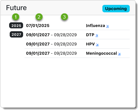 - Future group: This group lists the next dose for any incomplete series due in the future.